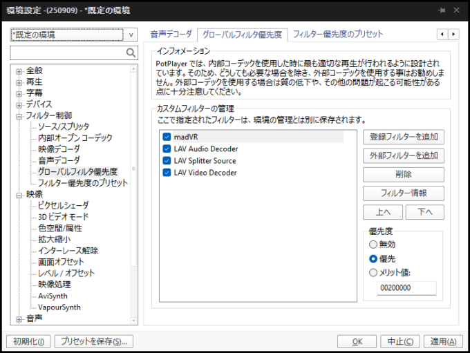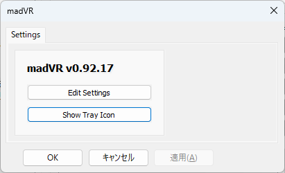 設定はトレイアイコンから「Edit madVR Settings …」または、Potplayerの環境設定で「フィルター管理」や「フィルター優先度」のところにある「フィルター情報」